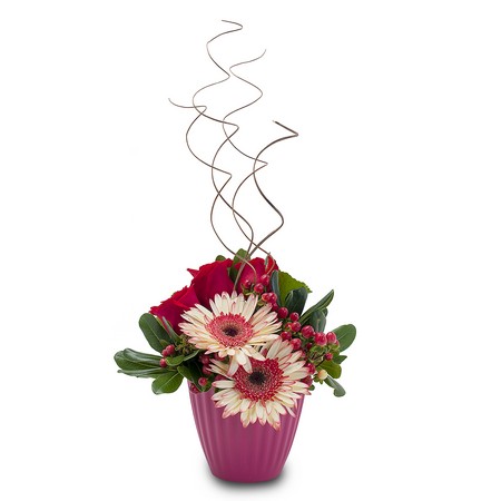 A pleasingly pink combination of Roses and Gerbera Daisies. Approximately 5" W X 11" H